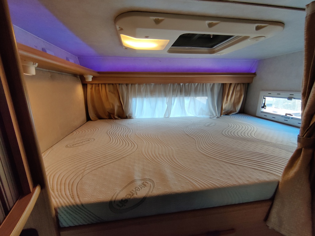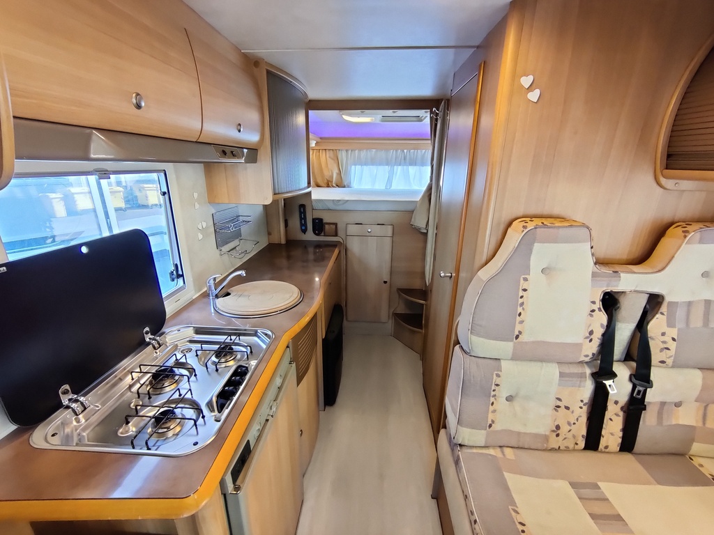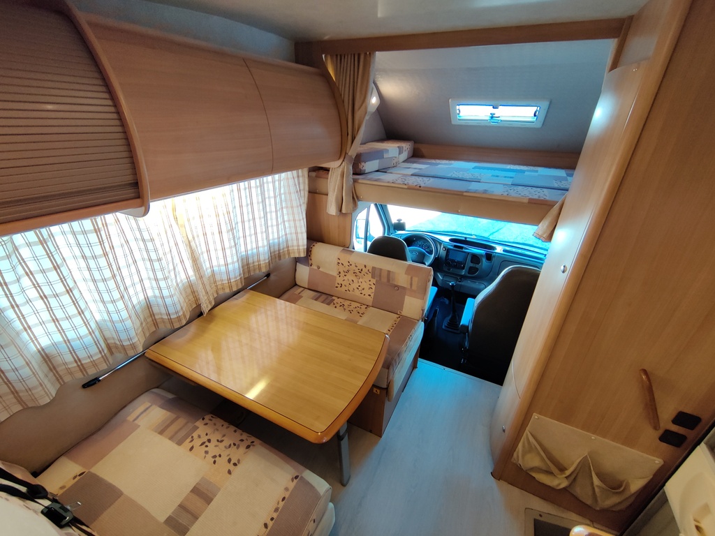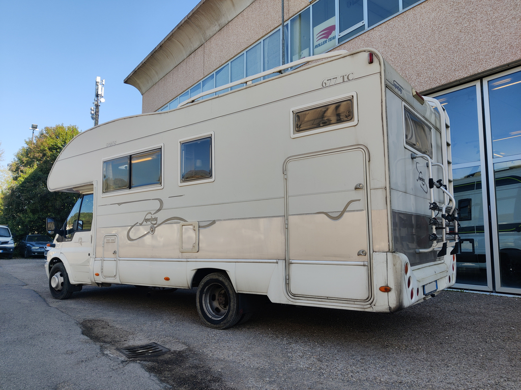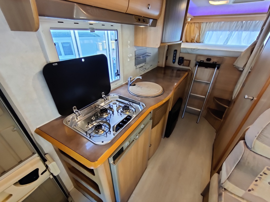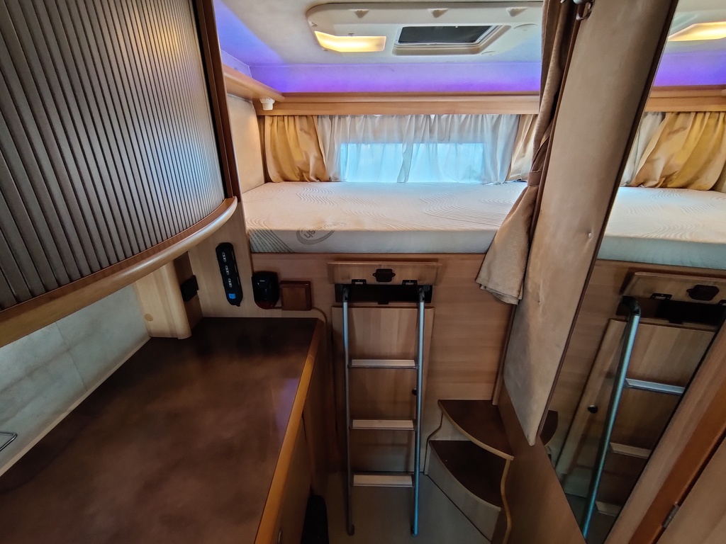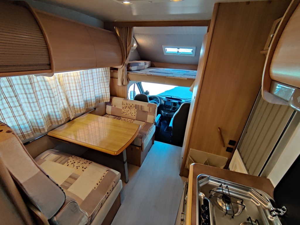 Questo camper si distingue per gli spazi interni ben organizzati, con letto matrimoniale in mansarda, letto trasversale posteriore e comoda dinette trasformabile. La presenza del garage posteriore attrezzato con rampa e plancia moto lo rende perfetto anche per chi desidera portare con sé scooter o attrezzatura sportiva.
