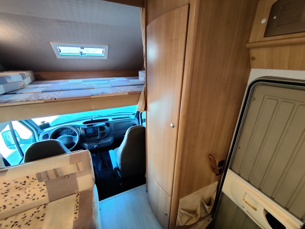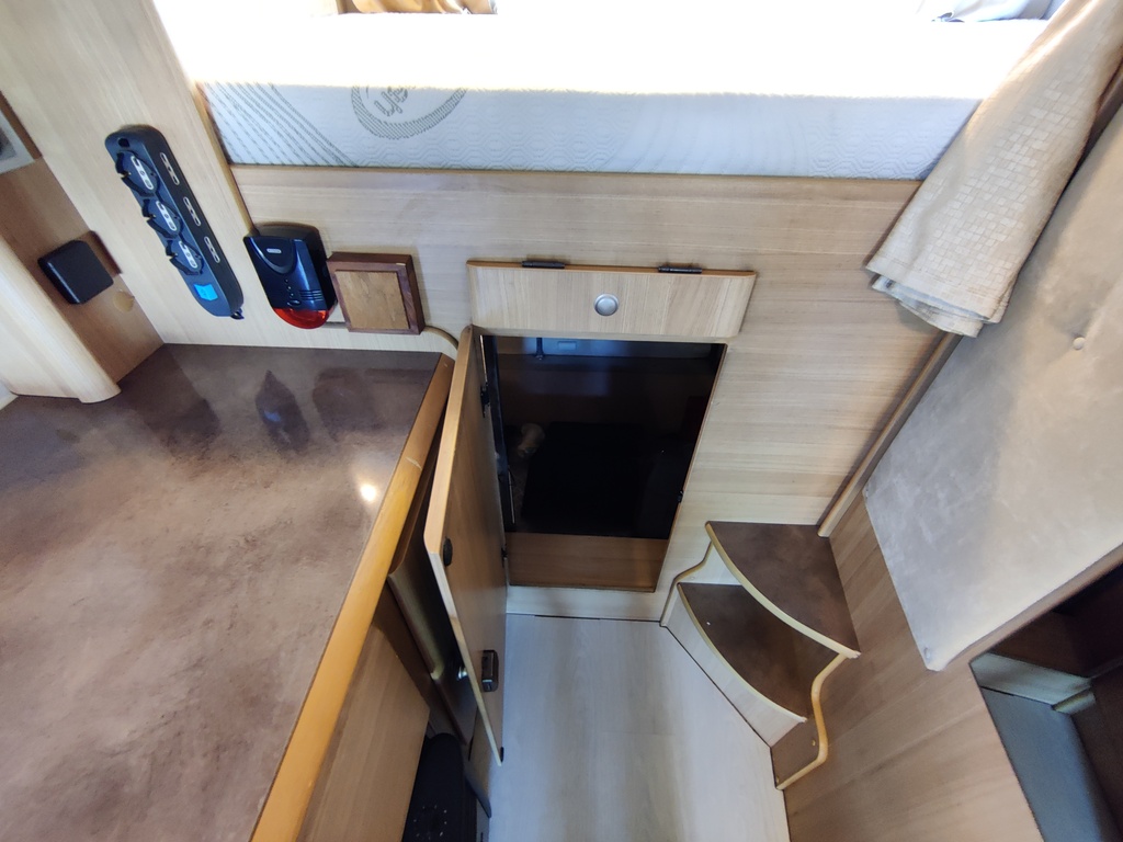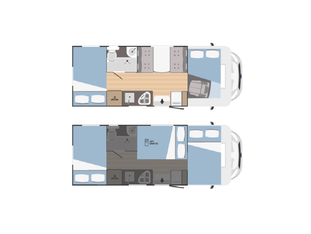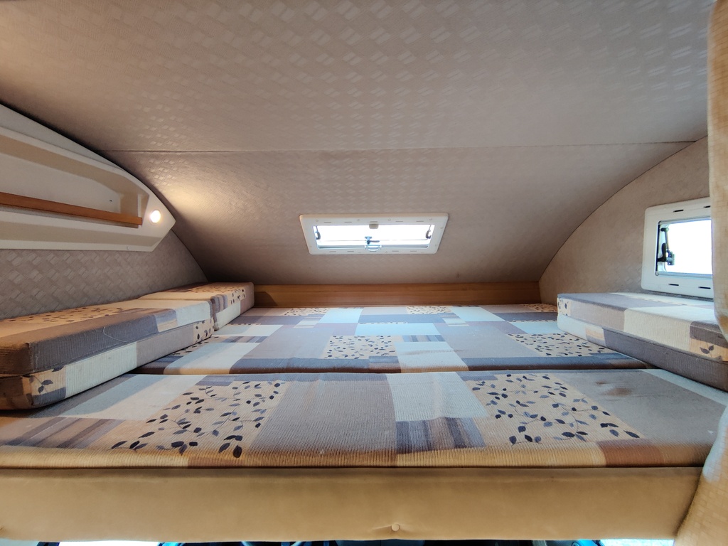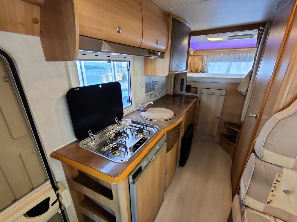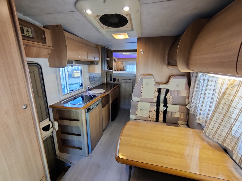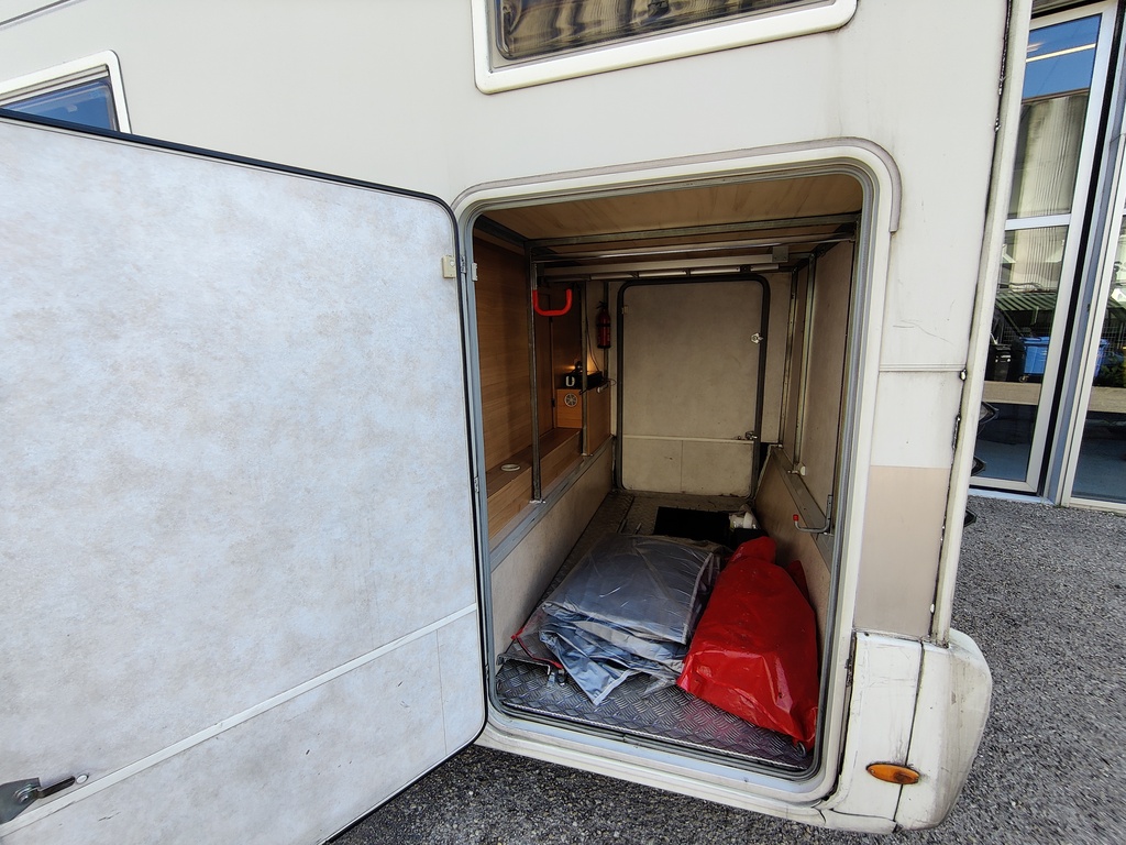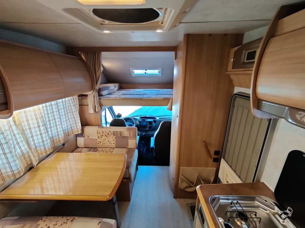 Questo camper si distingue per gli spazi interni ben organizzati, con letto matrimoniale in mansarda, letto trasversale posteriore e comoda dinette trasformabile. La presenza del garage posteriore attrezzato con rampa e plancia moto lo rende perfetto anche per chi desidera portare con sé scooter o attrezzatura sportiva.